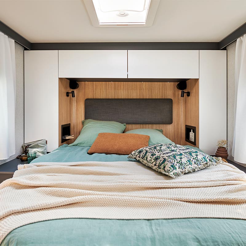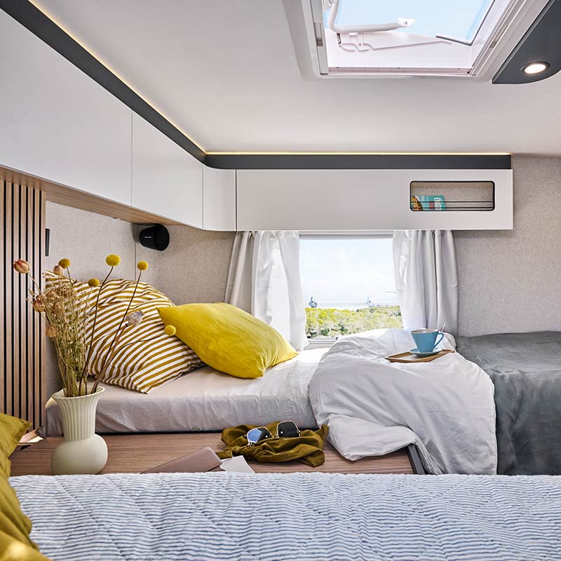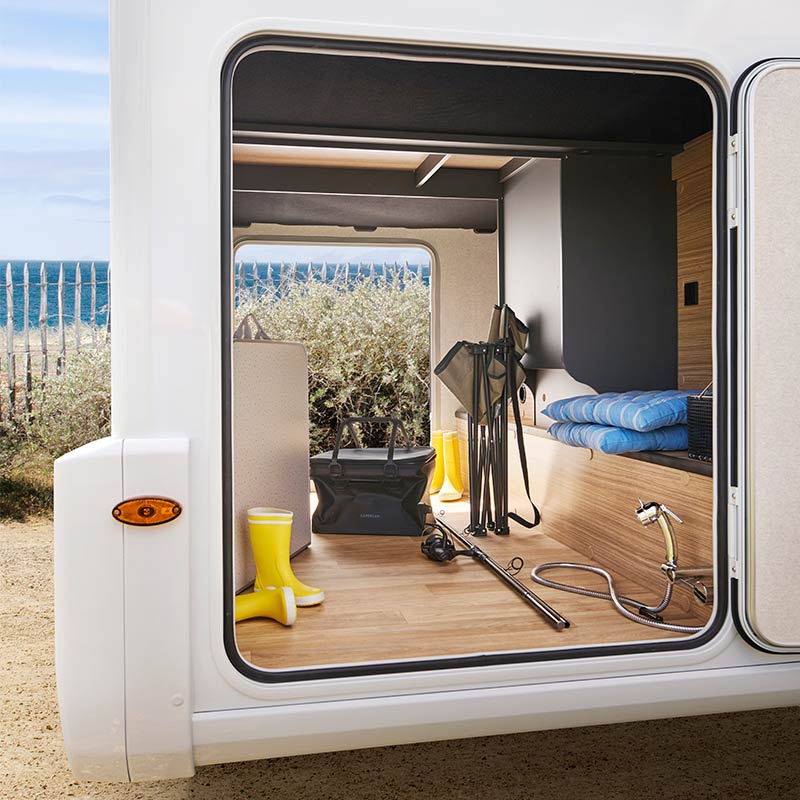 - Une soute réglable en hauteur électriquement sous le lit central (uniquement sur le modèle P720FC) pour gagner encore plus de volume de rangement.