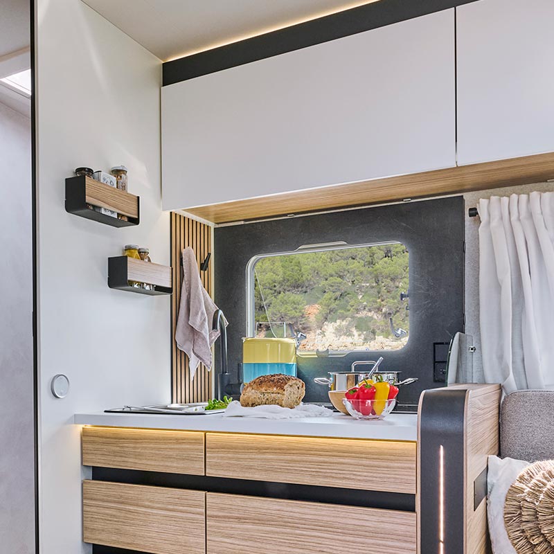 - une prise gaz accessible directement depuis l’extérieur : profitez de la cuisine en plein air en toute sécurité ! Préparez-vous de bons petits plats au réchaud, à la plancha ou au barbecue à gaz en utilisant directement la réserve du camping-car, sans bouteilles supplémentaires ni installation compliquée.