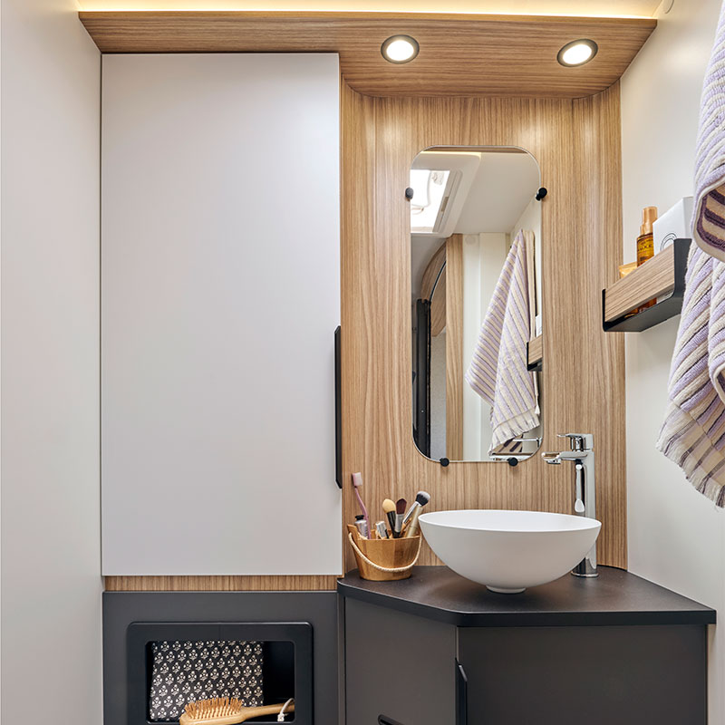 – Une poubelle intégrée dans la cuisine, avec accessoires pour compartimenter.- Un porte-serviettes repliable dans la salle d’eau et un caillebotis dans la douche.