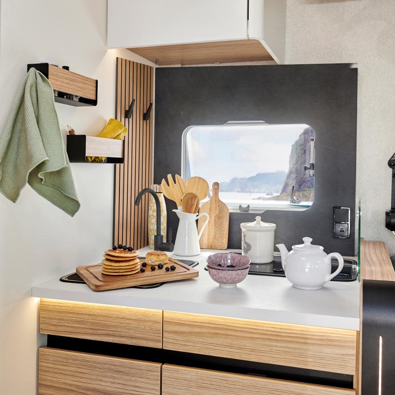 - Un chauffage hybride Combi D6 E TRUMA® 6 000 W fonctionnant au diesel et à l’électricité (230 V), pour une montée en température plus rapide et une plus grande autonomie que le gaz.
